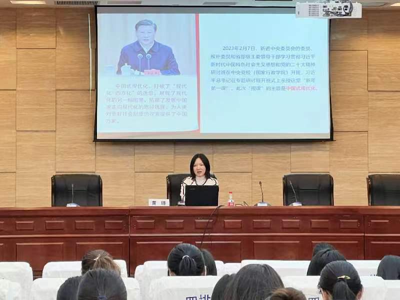 3月10日,万象城awcsport官网联合人文与社会科学学院、艺术学院在外院国际会议中心开展 “青马工程”第三讲——《以中国式现代化全面推进中华民族伟大复兴》,来自马克思主义学院的青年优秀教师黄璐为三个学院“青马工程”培训班的学员们带来了一堂精彩的授课。